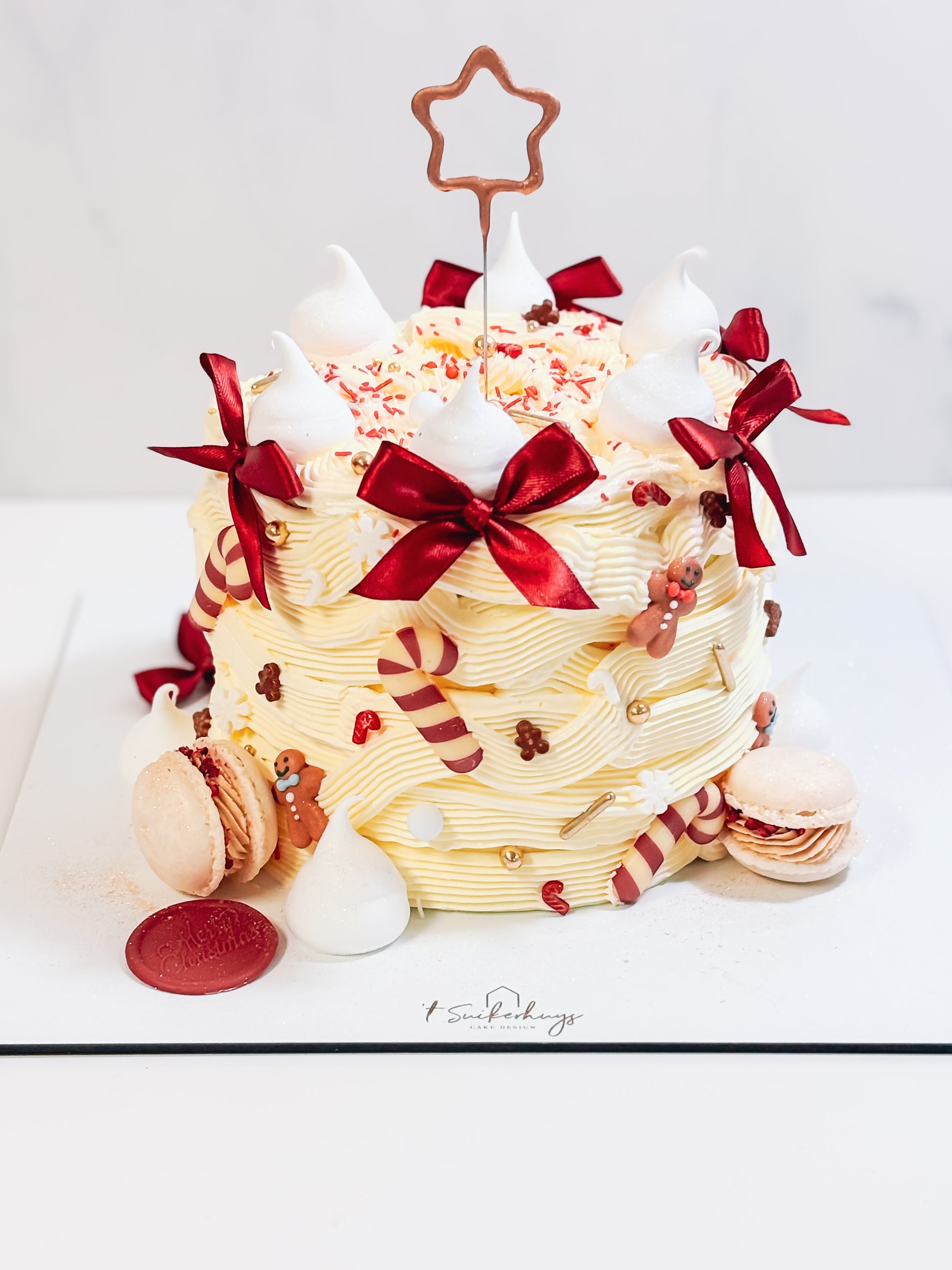 Deze kersttaart mag niet ontbreken aan jouw feesttafel! Afgewerkt met meringues en macarons. Een feest op je bord!